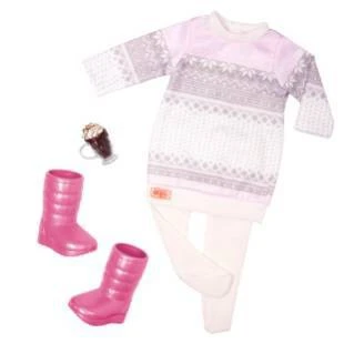 Take a sweet trip to the Cozy Cabin with Sandy! This Our Generation 18-inch doll has dark-brown eyes that open and close, long brown hair that’s fun to brush and style, and is posable! Sandy can bend her knees and elbows and rotate her neck, arms, and legs to easily change into her 2 colorful outfits. She arrives wearing a festive sweater dress with comfy leggings and pink boots. Dress Sandy in the cute ski lift graphic top with the gray joggers and snuggle under the fluffy blanket to enjoy a story with tasty cookies! Follow Sandy’s journey in the “Off to Winter Camp” storybook as she tries to solve a yeti mystery! The easy-to-read chapters are perfect for younger readers, and it makes for a great bedtime story too! (Our Generation Cozy Cabin sold separately)